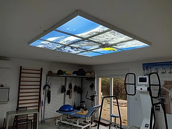 Mr Raveau, kinésithérapeute, à St Jean de Maruejols (30), avait depuis longtemps l’intention d’installer un décor lumineux dans la salle centrale de son cabinet. Cette salle comporte des appareils sophistiqués de rééducation, elle est éclairée par des luminaires d’une autre époque.