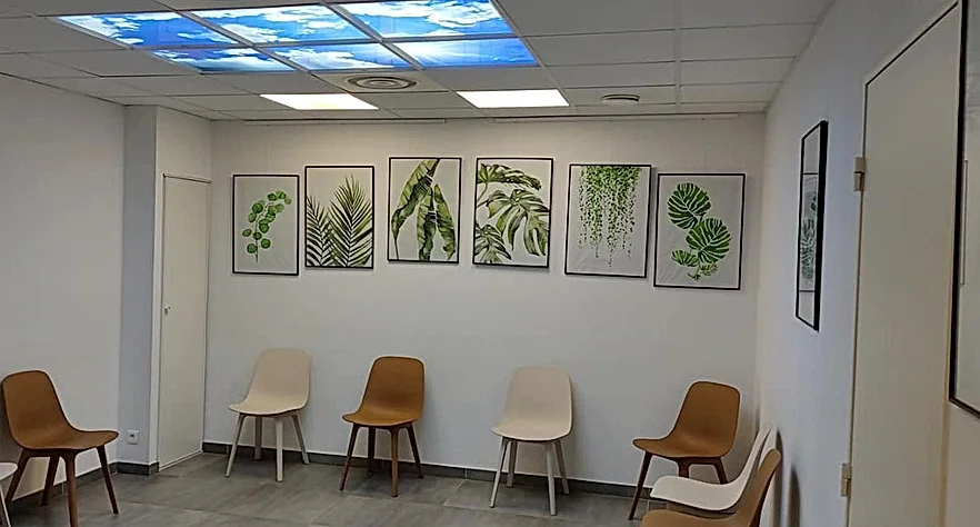 La salle d’attente du cabinet, auparavant fermée et sans ouverture sur l’extérieur, était perçue comme confinée, générant parfois stress et inconfort chez les patients. Pour transformer ce lieu en un espace de calme et de sérénité, la solution choisie a été l’installation de plafonds lumineux avec des visuels inspirés de la nature et équipés de luminaires LED dimmables.